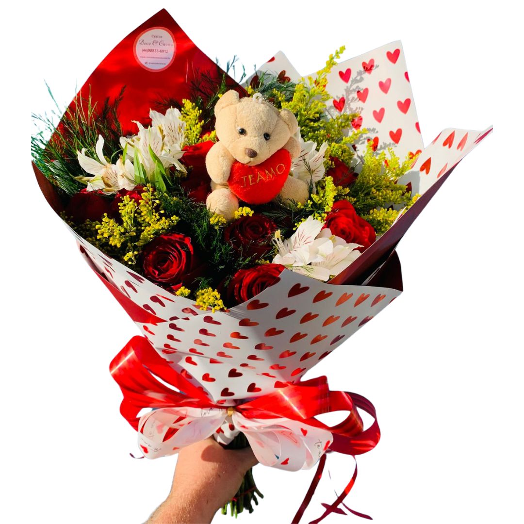 Uma perfeição em forma de buquê. Lindo arranjo montado com 12 rosas e um mini ursinho para dar um charme especial.
