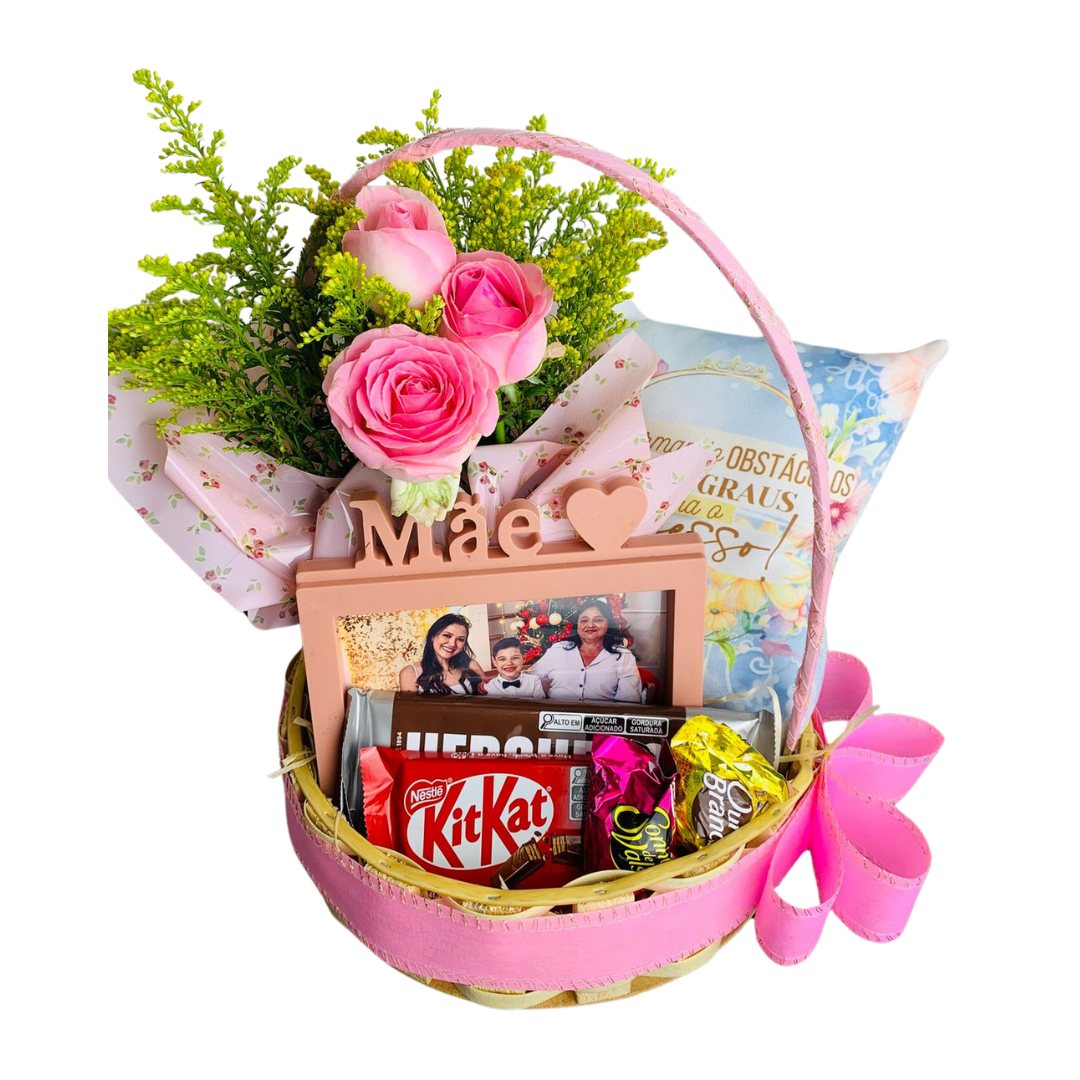 Cesta de Chocolates com um lindo arranjo composto por 3 rosas cor de rosa, almofada com dizeres motivacionais, porta retrato, barra de chocolate, Kit Kat e 2 bombons.